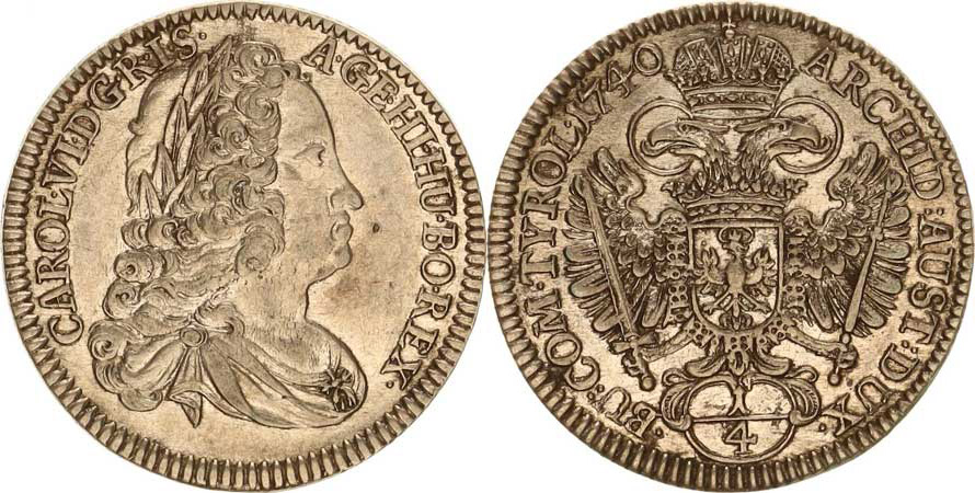 Karel VI. (1711-1740), 1/4 Tolar 1740, Tyroly, Hall opis: ARCHID: AUST: DUX. - .BU:COM.