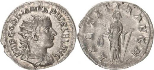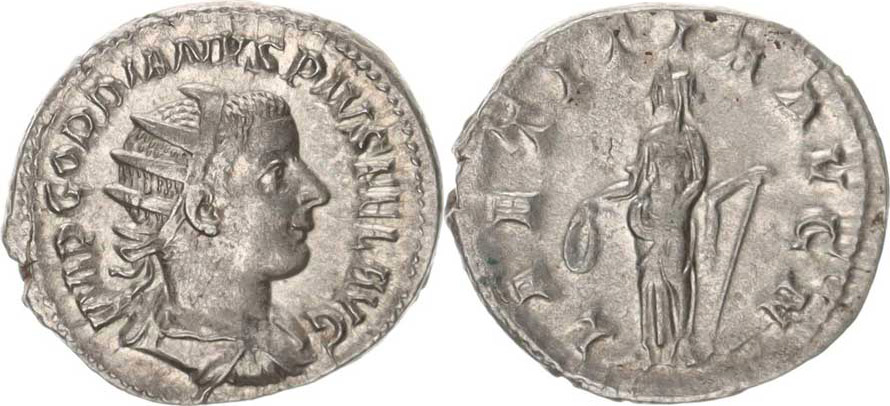 Gordianus III. (238-244), Antoninián, stoj.Laetitia drží věnec a kotvu