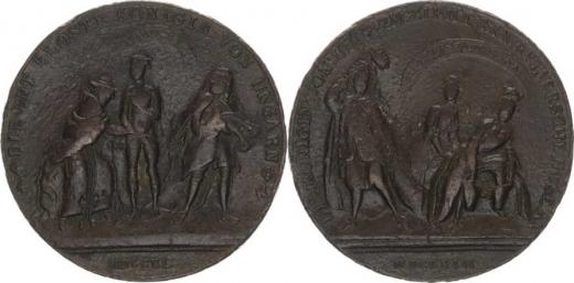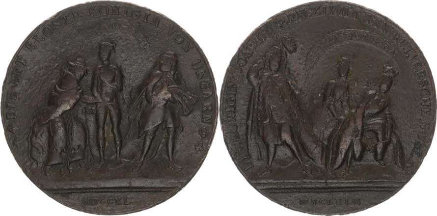 Medaile 1742 - Posměšná, na uherskou korunovaci 1742, zástupci st avů svlékají královnu, opis / královna si obléká kalhoty, opis bronz 40 mm