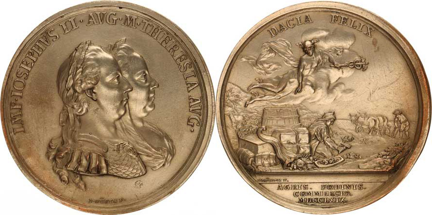 Marie Terezie a Josef II., dvojportrét zprava / Na zlepšení zeměd ělství, hornictví a obchodu v Transylványi 1769, symboly sign .: F.Fürth postř. Cu 59 mm Schau und Denkmünzen MT CCXX