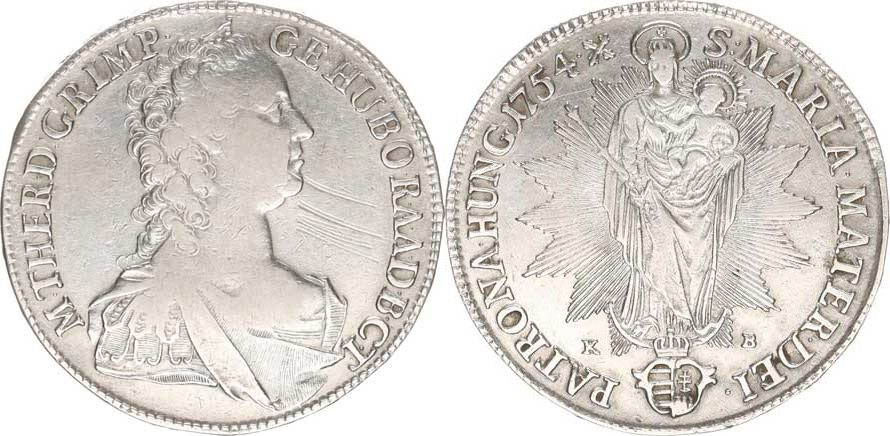 Tolar 1754 K-B, Kremnica jako Husz. 1675, tečka rozděluje M. THER. / S: MARIA. MATER. DEI. - PATRONA. HUNG. 1754. X - jiné tva ry paprsků a umístění minc. značky "R" 27,864 g, dr. rys.