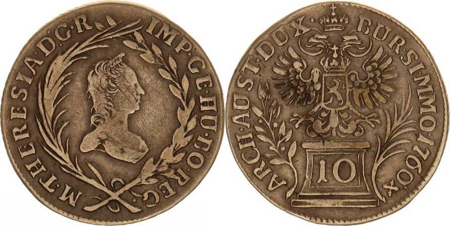 Marie Terezie (1740-1780), 10 kr. 1760 b.zn., Praha-Erdmann "R"