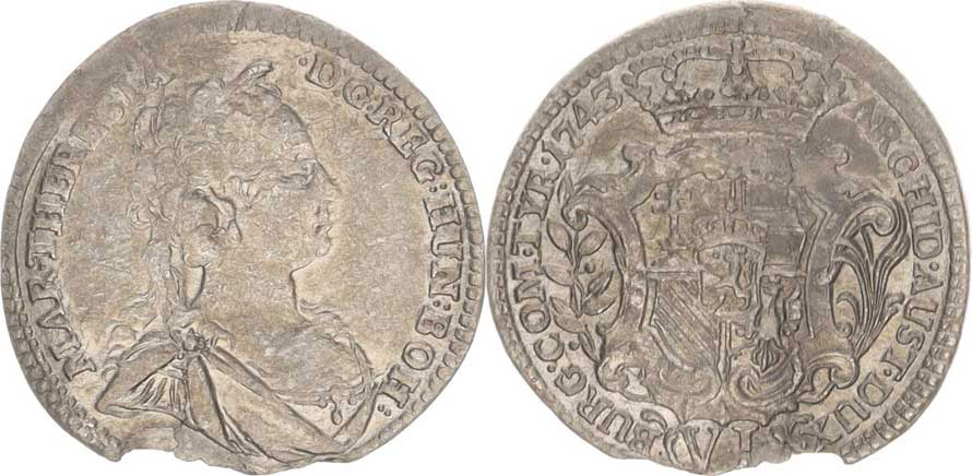 VI kr. 1743 b.zn., Praha-Scharff "RRR" jako MKČ 1965, tečka za THERESIA. - . D: G: REG: HUN: BOH:, vylom. kraj