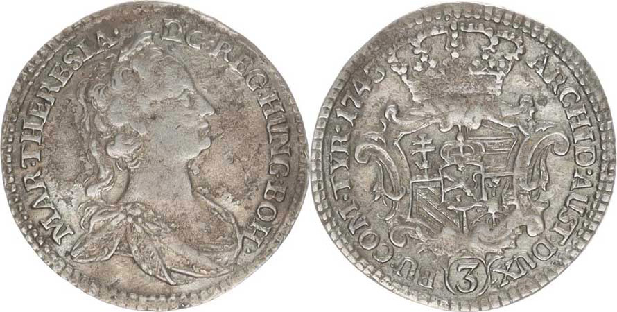 Marie Terezie (1740-1780), 3 kr. 1743 b.zn., Praha "R"