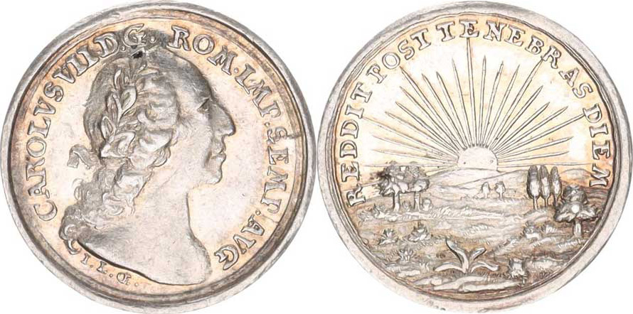 Karel VII. (1742-1745), Medaile b.l. (1742), Hlava zprava a opis / Paprskovité slunce nad