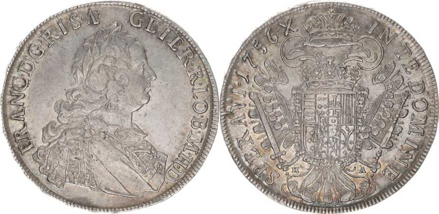 František Lotrinský (1745-1765), 1/2 Tolar 1756 H-A, Tyroly, Hall "R"