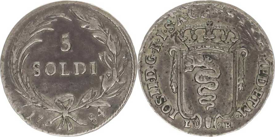 5 Soldi 1784 L-B, pro Lombardsko "R", nedor., patina