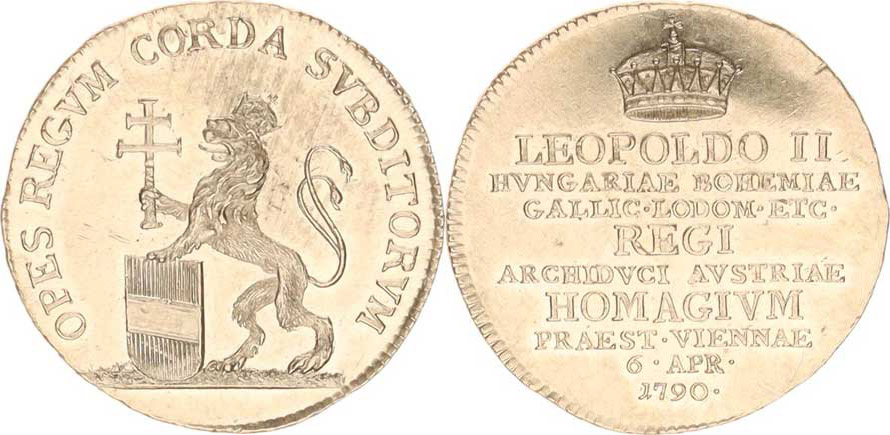 Leopold II. (1790-1792), Menší žeton na holdování ve Vídni 6.4. 1790, Koruna a 9-ti řádk.