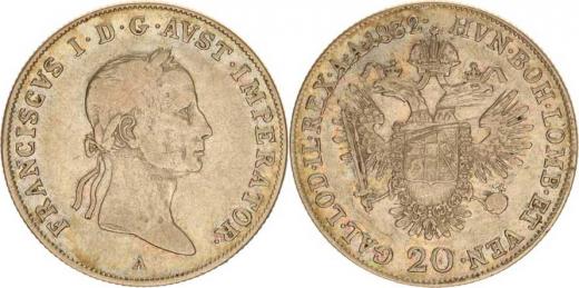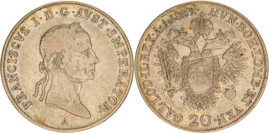 František I. (1792-1835), 20 kr. 1832 A - var.: tečka mezi A a datací uprostřed, škr.