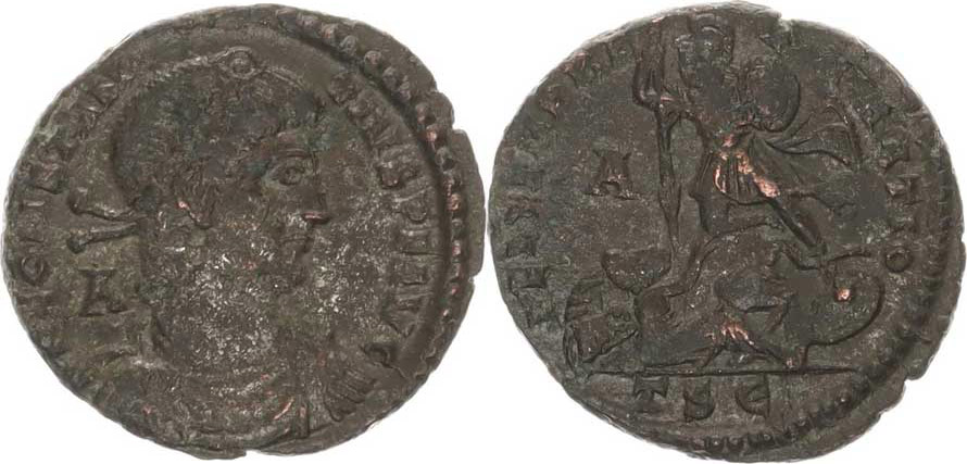 AE 23, voják v přilbě drží štít a kopím sráží nepřítele z koně, v poli písmeno A FEL TEMP REPARATIO minc. Thessalonica (TSE) RIC VIII 129