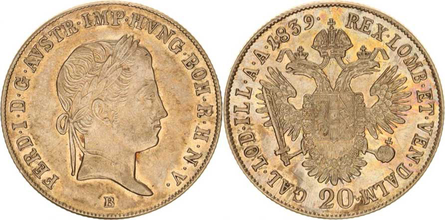 Ferdinand V. (1835-1848), 20 kr. 1839 B - orlice "RR"