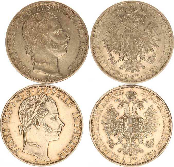 František Josef I.(1848-1918), Zlatník 1860 A - obě varianty (s tečkou a bez za REX) 2 ks