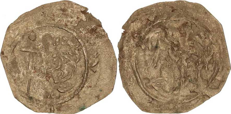 Denár - poprsí zprava, před sebou drží meč / anděl zleva klečící před palmovým stromem, před sebou drží prapor nález Ladná (z doby 2. křížové výpravy v letech 1147-48) PV 239 "RR " 0,342 g, nedor.