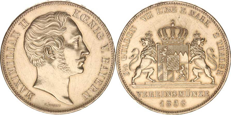 Bavorsko, Maximilian II. (1848-1864), 2 Tolar (3-1/2 Gulden) 1856 - dva gryfové nesoucí erb KM 837