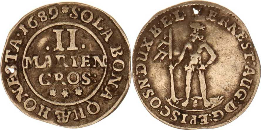 Brunsw-Luneb-Calenb, Ernst August (1679-1698), 2 Mariengroschen 1689 - divý muž KM 256, malá dírka
