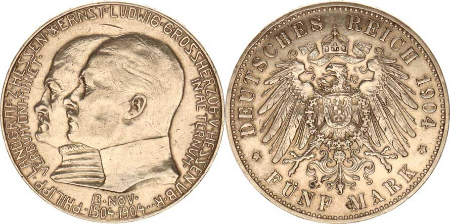 Hesse-Darmstadt, Ernst Ludwig (1892-1918), 5 Mark 1904 A - 400. výročí narození Phillippa KM 373, r