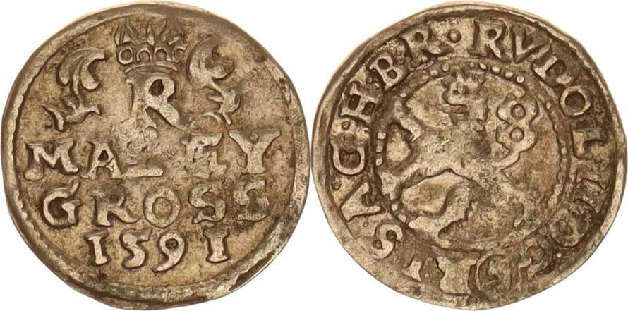 Rudolf II. (1576-1612), Malý groš 1591, Č.Budějovice-Mattighofer HN 27 bez teček v av.
