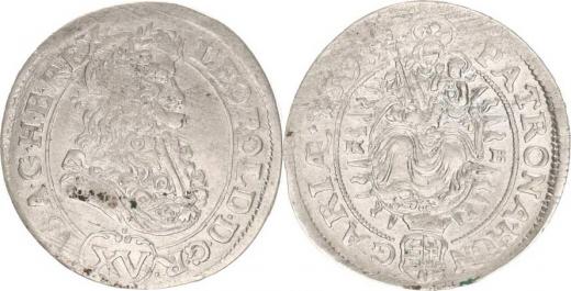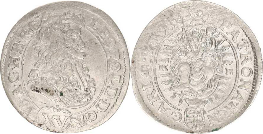 XV kr. 1691 KB Hol. 91.2,1 var.: v av. hladký kruh, rv. perl. kruh, písmeno X je v hlavě panovníka, pod zn. á 5-ti plamenech , mír. nedor.