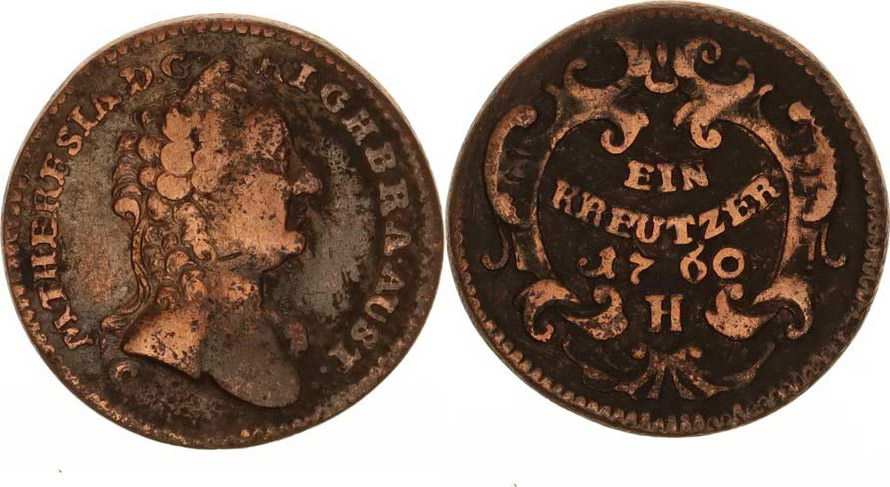 Marie Terezie (1740-1780), 1 kr. 1760 H, Tyroly Hall "R"