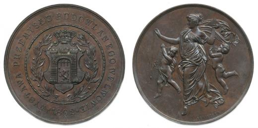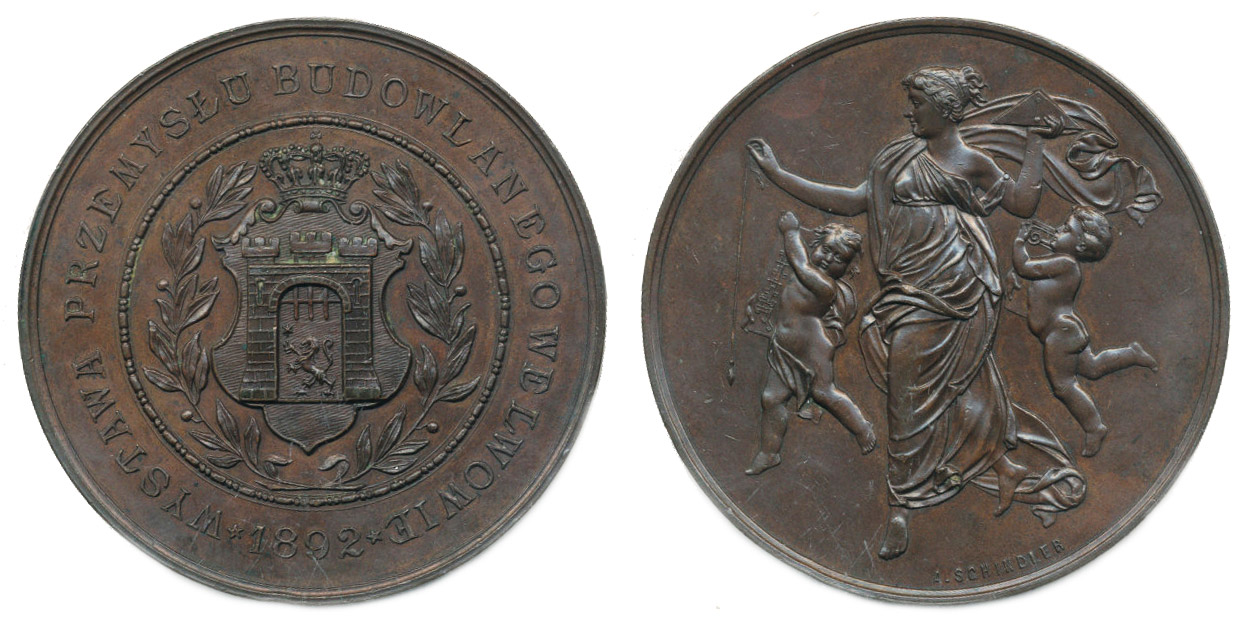 Lwow (Lvov) - Medaile 1892 na průmyslovou výstavu, A: Městský znak, opis: WYSTAWA PRZEMYSLU BUDOWLANEGO WE LWOWIE *1892* /R: Alegorie, bez opisu sign.: A. SCHINDLER hnědě patin. bronz 50 mm