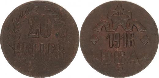 20 Heller 1916 T - měď KM 15 var.: jiný typ koruny_mírně nedor.