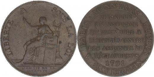2 Sols - Token 1791, Monneron Freres Negoocians - bronzKM Tn 23
