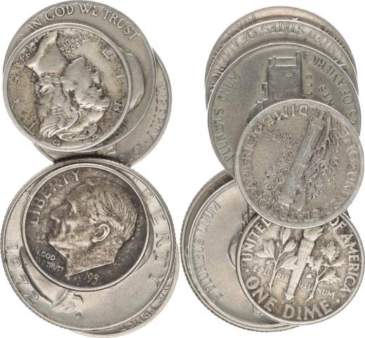 1 Dime 1942 S, 1951; +5 Cents 1947, 1972, 1975, 1976, 1989 D;+1/4 Dollar 1972 D 8 ks