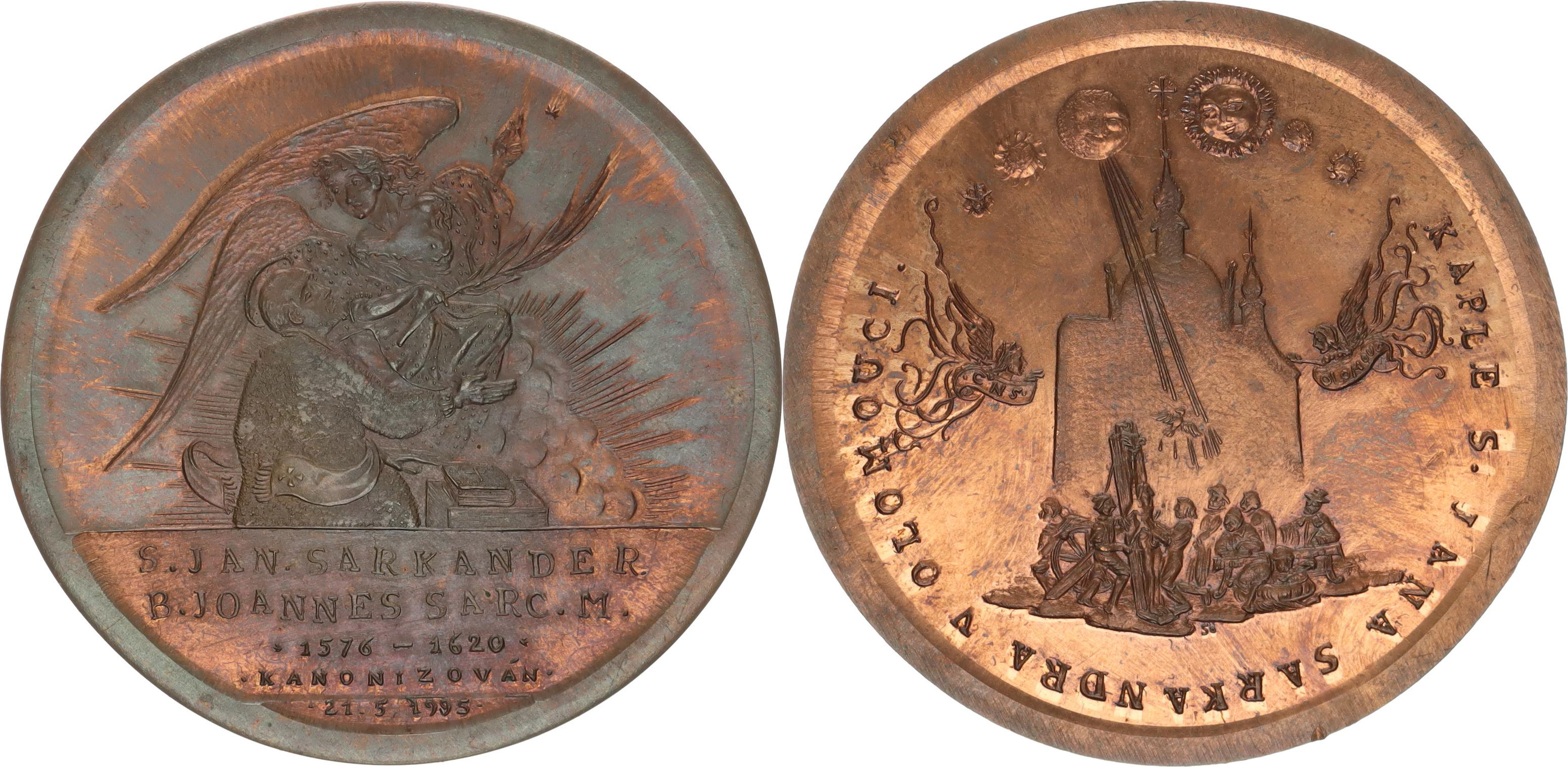 Kanonizace Jana Sarkandra 21.5 1995, sv. Jan s Andělem / Kaple sv. Jana Sarkandra v Olomouci s výjevem mučení vydala pob. ČNSv Olomouci Cu 52 mm PMP - B 40 A