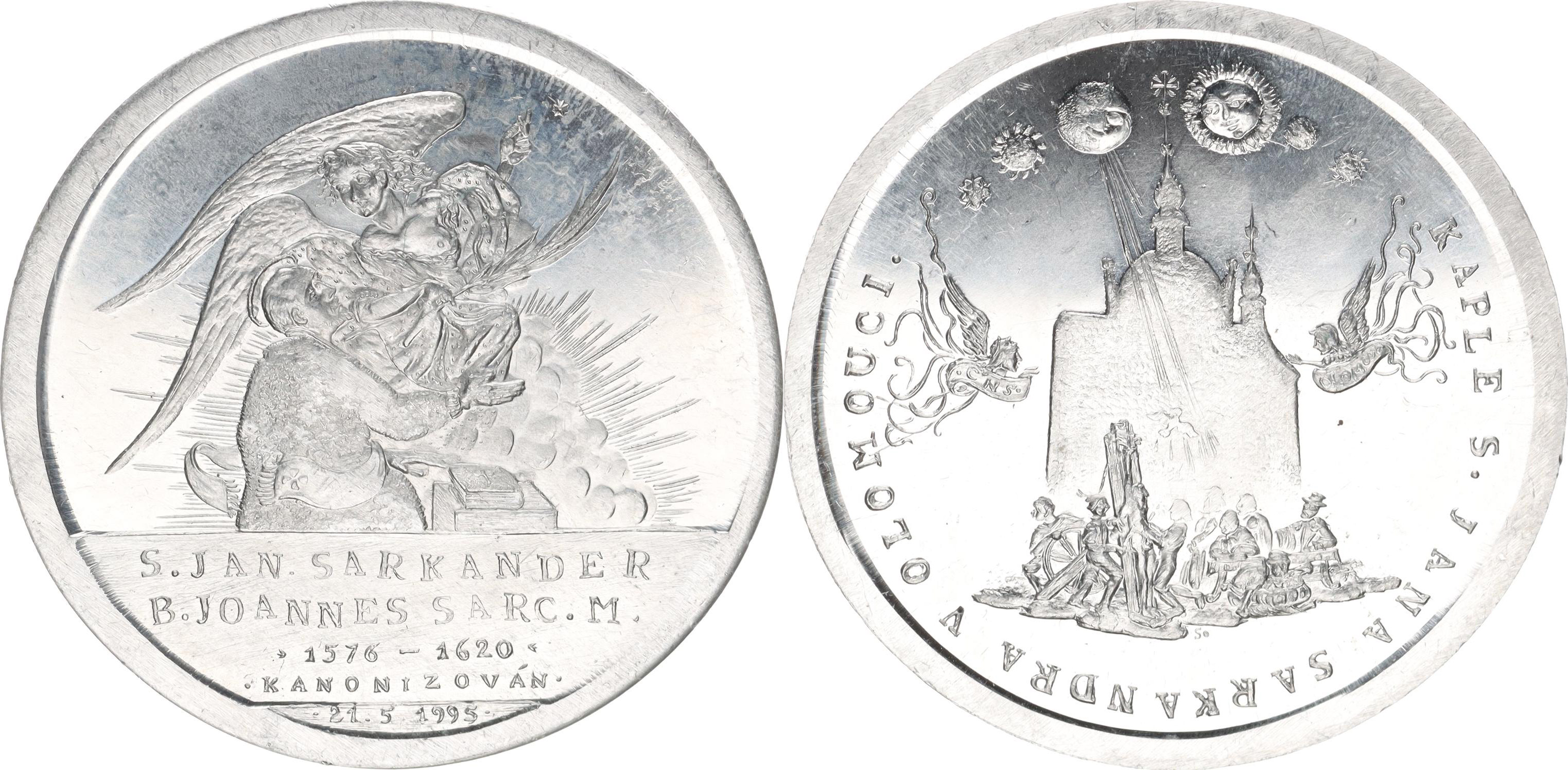 Kanonizace Jana Sarkandra 21.5 1995, sv. Jan s Andělem / Kaple sv. Jana Sarkandra v Olomouci s výjevem mučení vydala pob. ČNSv Olomouci Al 52 mm PMP - B 40 E