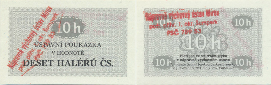 10 Haléřů 1981 - ústavní poukázka , razítko: Nápravně výchovný ústav Mírov pošt. přihr. 1 okr. Šumperk PSČ 78953 (3řádk. nápis čeerv. barvy) - razítko z obou stran