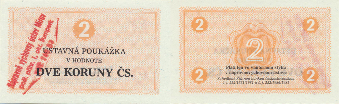 2 Koruny 1981 - ústavná poukážka , razítko: Nápravně výchovný ústav Mírov pošt. přihr. 1 okr. Šumperk PSČ 78953 (3řádk. nápis červ. barvy)