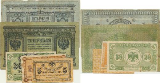 5 Rubl 1918, +3 Rubl 1919, +30, 10, 5 Kopějek 1918 5 ks