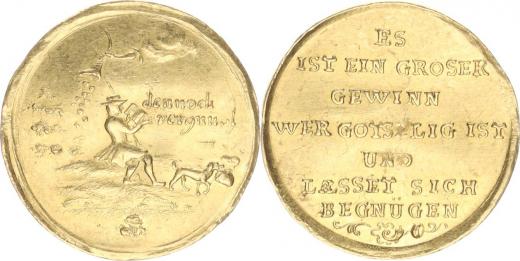 Dukátová medaile pro štěstí, A: Boží ruka vysypává peníze z rohuhojnosti, muž s knihou a pes s měšcem, opis: "den noch vevgnü..."/ R: Sedmiřádkový nápis Au 23 mm 3,456 g
