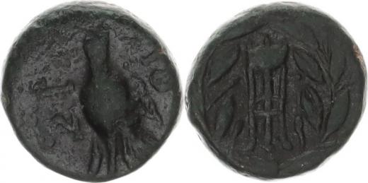 AE 15, holubice zleva se krmí / trojnožka ve věnci (4,329 g)BMC 182