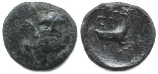 AE 14, A: Vousatá hlava Herakla se lví kůži a kyjem přes rameno / R: Přední část jelena zprava s hlavou zvrácenou nazad, před ním pochodeň, nad ním písmena BMC 38-39; SNGvA 5286 2,33 g