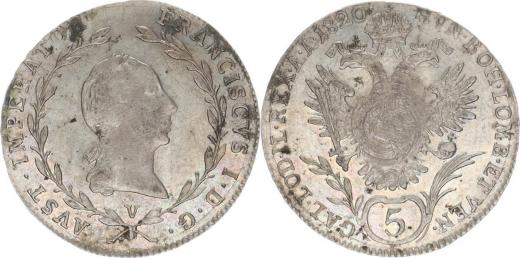 5 kr. 1820 V "R"_mír nedor. střed, tém.