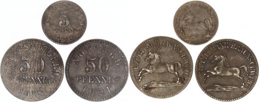 Braunschweig - 5 Pfennig 1918, Kriegsnotgeld Fe+50 Pfennig 1918, +1921 Kriegsnotgeld Fe 3 ks