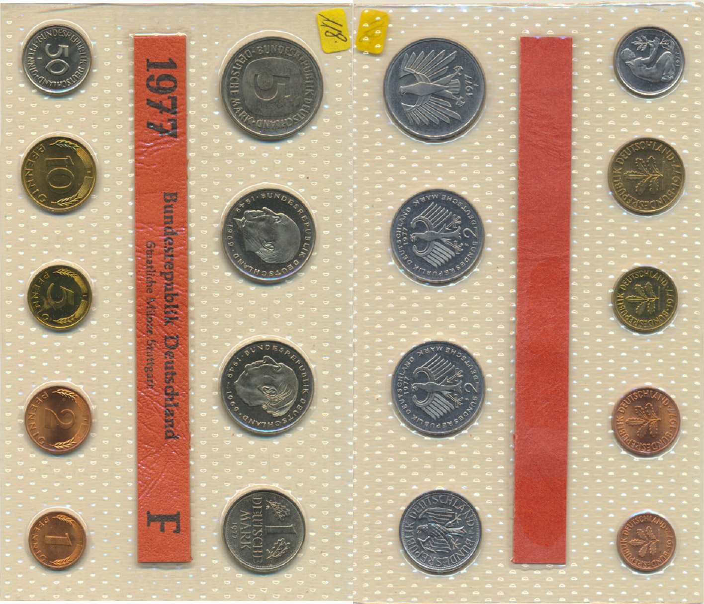 Ročníková sada mincí 1977 minc. F (1, 2, 5, 10, 50 Pf., 1, 5,2 DM - Adenauer, Heuss) 9 ks zataveno v orig. folii mincovny MS 14