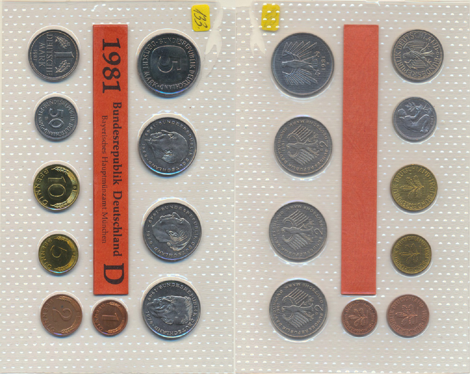 Ročníková sada mincí 1981 minc. D (1, 2, 5, 10, 50 Pf., 1, 5,2 DM - Adenauer, Heuss, Schumacher) 10 ks zataveno v orig. folii mincovny MS 29_natrž roh folie
