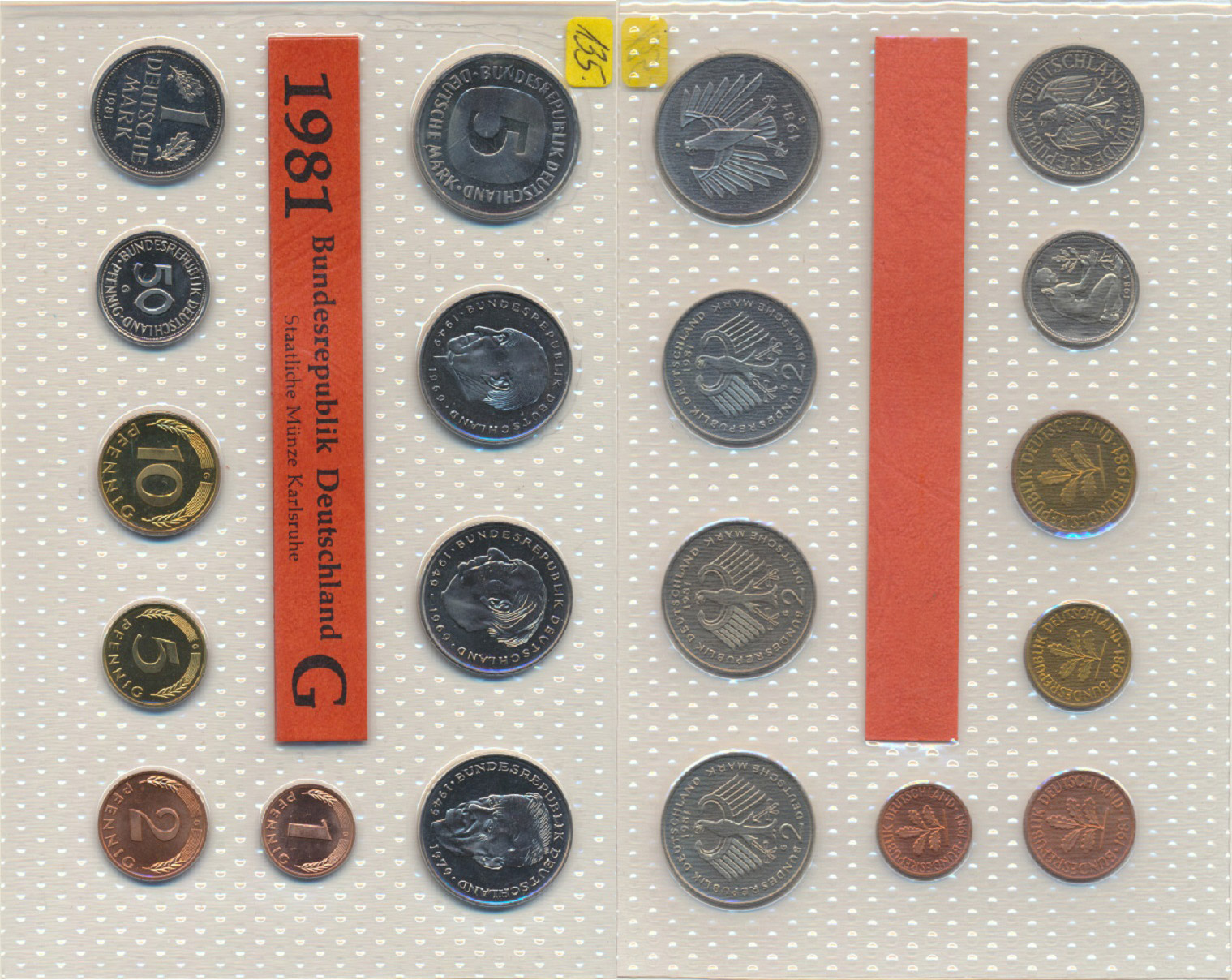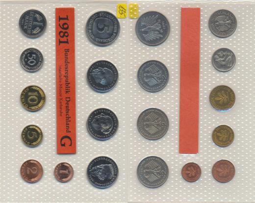 Ročníková sada mincí 1981 minc. G (1, 2, 5, 10, 50 Pf., 1, 5,2 DM - Adenauer, Heuss, Schumacher) 10 ks zataveno v orig. folii mincovny MS 31