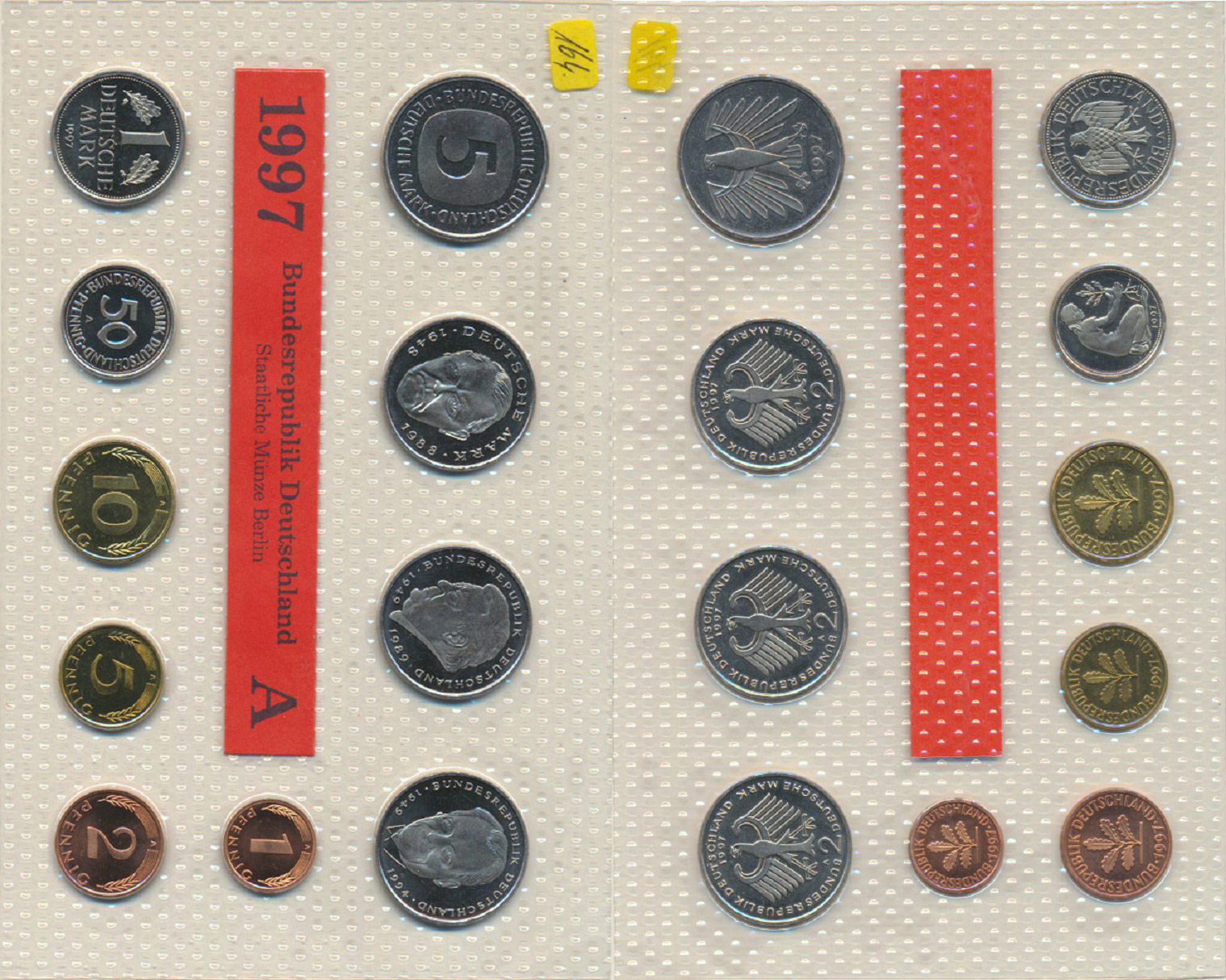 Ročníková sada mincí 1997 minc. A (1, 2, 5, 10, 50 Pf., 1, 5,2 DM - Eberhart, Strauss, Brandt) 10 ks zataveno v orig. foliimincovny MS 99