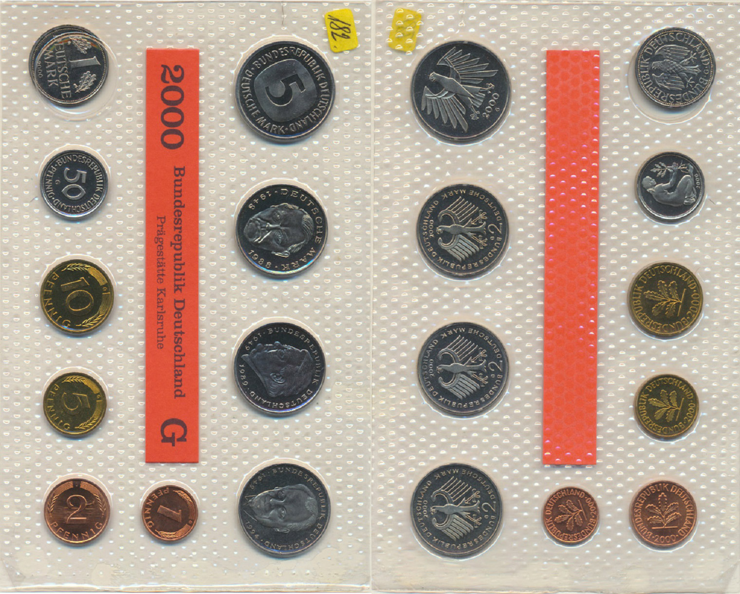 Ročníková sada mincí 2000 minc. G (1, 2, 5, 10, 50 Pf., 1, 5,2 DM - Eberhart, Strauss, Brandt) 10 ks zataveno v orig. foliimincovny MS 117
