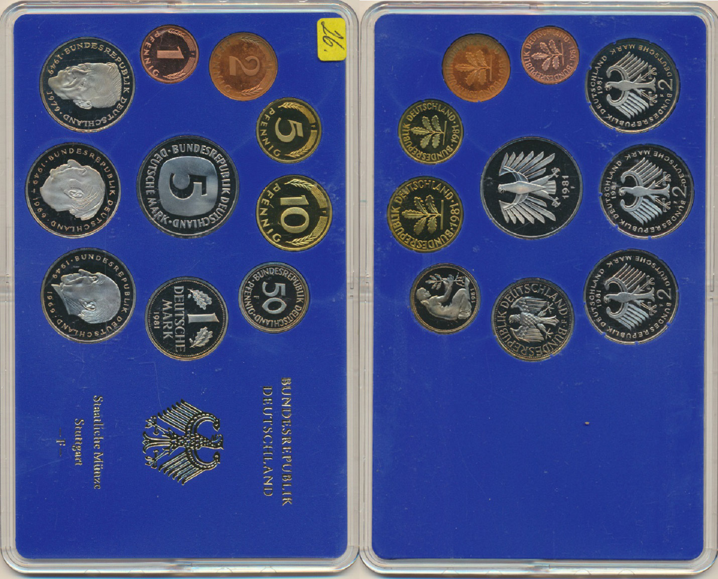 Ročníková sada mincí 1981 minc. F (1, 2, 5, 10, 50 Pf., 1, 5,2 DM - Adenauer, Heuss, Schumacher) 10 ks v orig. plexi balenímincovny PS 61