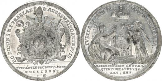 Medaile k 50. výročí kněžství 1731-1781, Zdobený erb, opis / Po sgtranách kostela dvě postavy pod Béžím okem sign.: F.M. Matzenkopf) Sn 36 mm 20,24 g_dr. škr., n. hr.