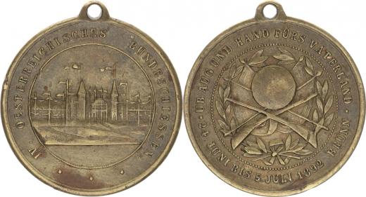 Brno - IV. Rakouské spolkové střelby 1892, střelecký pavilon /Střelecká alegorie a německý opis mosaz 31 mm Taul 3