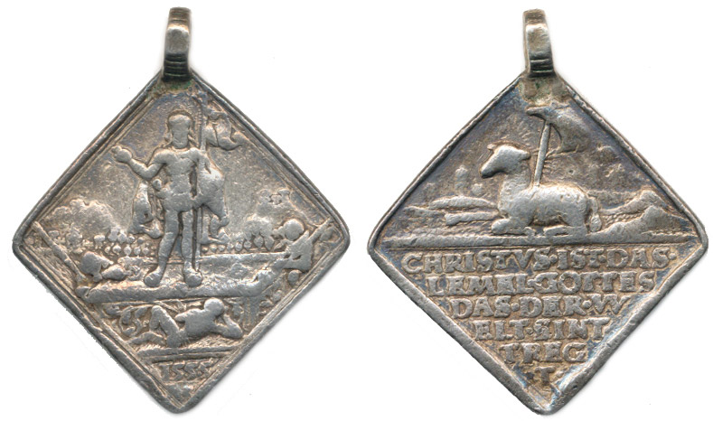 Medaile 1555, A: Vzkříšený Kristus s korouhví na tumbě, kolem tři spící vojáci, v úseči letopočet 1555 / R: Beránek Boží s korouhví, v úseči 6ti řádkový nápis Ag klipa 25x25 mm 8,82 g ouško Don. 4432; MMM Kremnica, p. č. K2-538