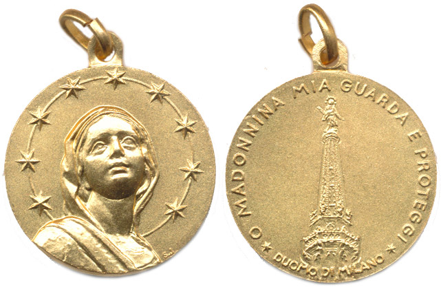 Itálie - Milano, Katedrála Narození Panny Marie, A: Hlava sochy Panny Marie na vrcholu hlavní věže katedrály, sign.: S. J. / R: Hlavní věž katedrály se sochou Panny Marie, opis zlacený kov 26 mm