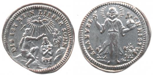 Německo - Křestní stříbrný žeton (kolem r. 1700), A: Svatý Jan křtí Krista v Jordánu, opis / R: Stojící Kristus s květinami u nohou, drží korunovační jablko s křížkem, symbol vlády, opisAg 16 mm 0,70 g "R"