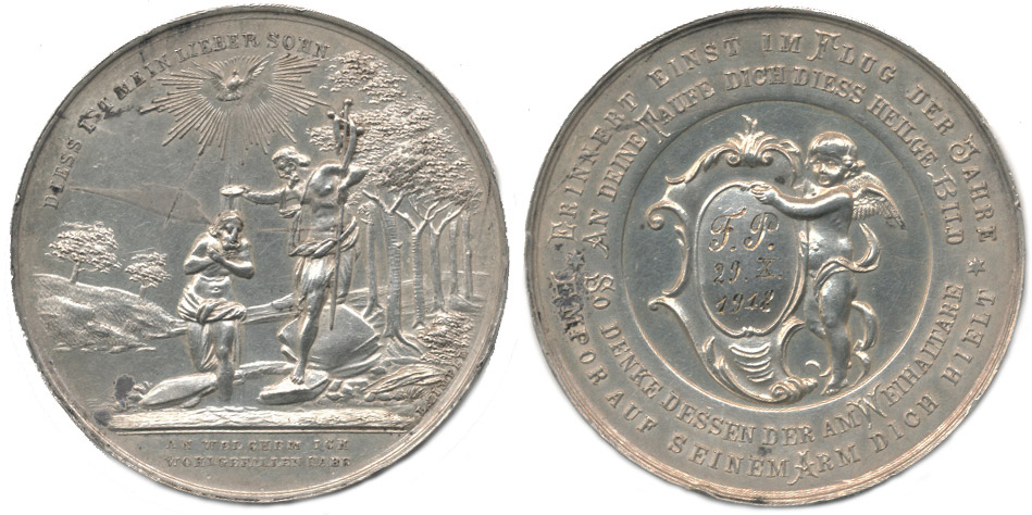 Rakousko - Křestní medaile, A: Výjev Kristova křtu v Jordánu /R: Putti drží kartuš s rytým věnováním: F. P. / 29. X. / 1918, opis ve dvou řádcích sign.: L. ZIMPEL Ag 39 mm