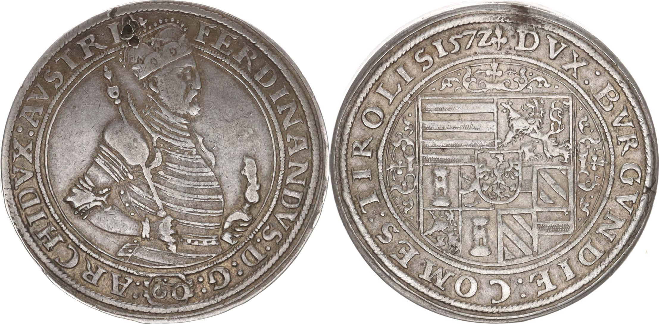 Zlatník (60 kr.) 1572, Tyroly Hall "RR" var.: av. MzA 57/ rv. M/T 221 - poprsí bez fleecových límců, kolem perličkový a hladký kruh, opis: FERDINANDVS:D:G: - : ARCHIDVX:AVSTRI /ornamenty kolem erbu, rozděl. zn. dvojtečky (24,528 g)_dr. vada stř.